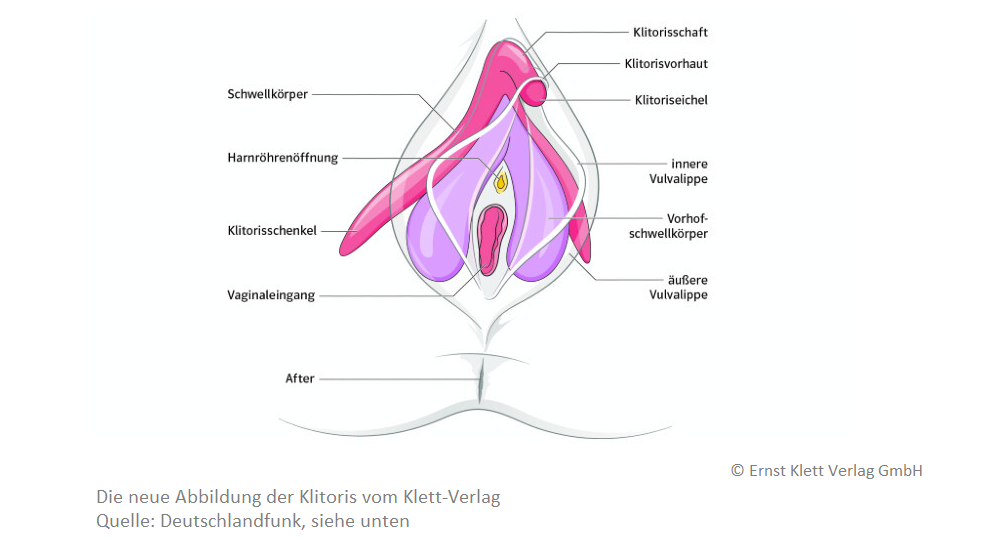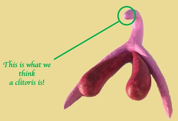 Viele, viele Jahre später dann „die Neuigkeit“! Das was wir als „die Klitoris“ kennengelernt haben, ist nur die Spitze des Eisbergs, nämlich die Klitoris-Eichel. Die Klitoris-Eichel ist allerdings nur der von außen sichtbare Teil der Klitoris. Hinzu kommen noch die Schenkel, die um die Vagina herum verlaufen, und zwei Schwellkörper, die unterhalb der Vulvalippen liegen. Die gesamte Klitoris ist nicht 1-2 cm, sondern stolze 9-11 cm lang!